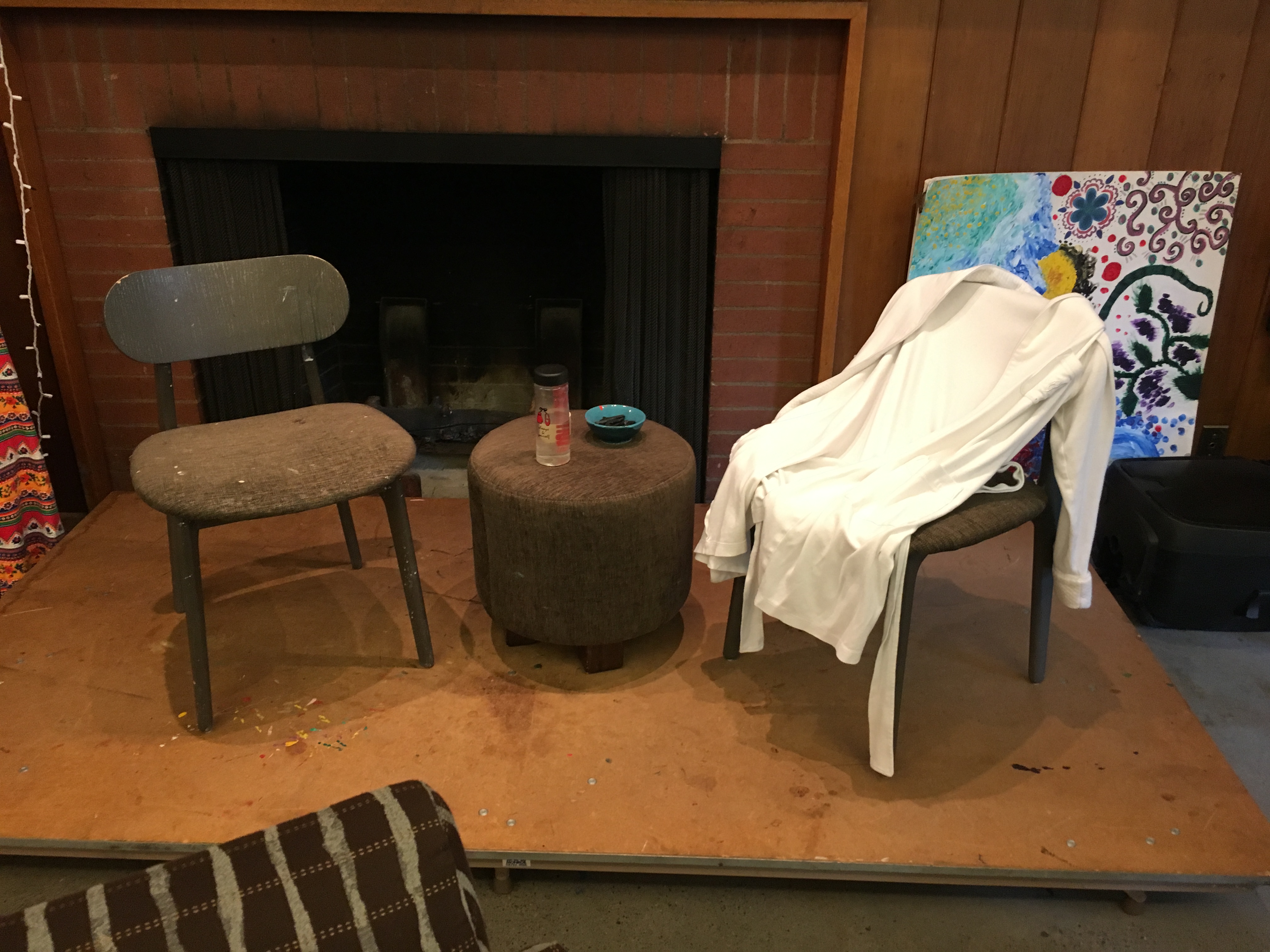 We met several times both in and out of the Blackbox theatre to rehearse our lines. At first, we thought about doing them without blocking, but it soon became evident that we would need to practice with it just for cohesion as well as a way to help us remember our lines by tying them to specific movements. We actually could only get into the blackbox once, and that time we had to cut down our practice time because the class that was in there went a little late. For the next time, we practiced in an unused Howard classroom, which is when we decided to use the classroom chairs to actually plan out/perfect our blocking. We also tried to rehearse once using outrageous accents in order to try to help remember our lines even with extraneous circumstances!
