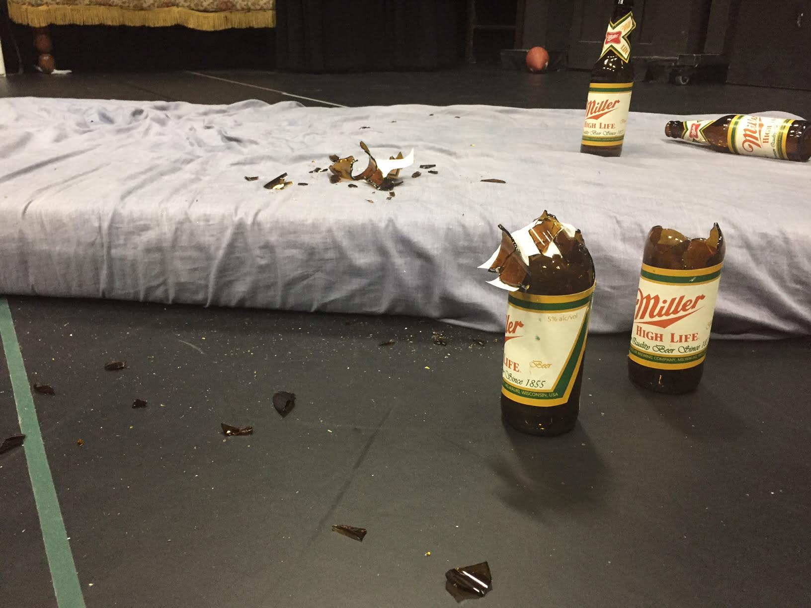 Jason and I both returned back from the holiday weekend refreshed and relaxed. During our rehearsal, we spent time blocking the last part of our scene. After we both didn't look at our lines for about a week, it was hard to jump back into character and the given circumstances of the play. By the end of the rehearsal, we made a little bit of progress on our scene by integrating specific movements for every moment of the scene. Unfortunately, that progress was stopped because we accidently broke two beer bottles during a "take". So we cleaned up the black box for twenty minutes, trying to pick up all the little pieces that were scattered all over the floor. Overall, I am very confident about our scene though at times I still find it hard to connect with my character.
