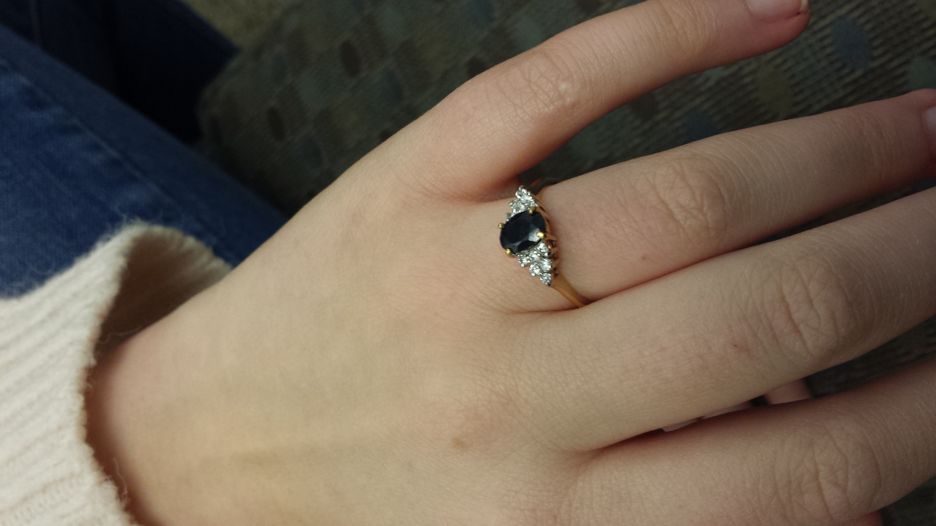 This week we met up for an hour to continue working on the notes we were given. We finally feel comfortable adding a couch to the blocking, per Rebecca's suggestion, and it definitely opened up our scene. The blocking feels much more natural now. It was a bit rough coming back from break, but we feel pretty good about what we ended up with. Emma worked on raising her status within the scene, and I worked on building up my anger. We're eager to get new notes on whether or not those were well=implemented. We've found all of our props and costumes for the show, which helped bring a sense of reality into the performance. I even brought an engagement-style ring from home that Emma will wear (see attached). After running the scene a few times, we feel ready for new notes, so we're excited to perform it for everyone tomorrow!