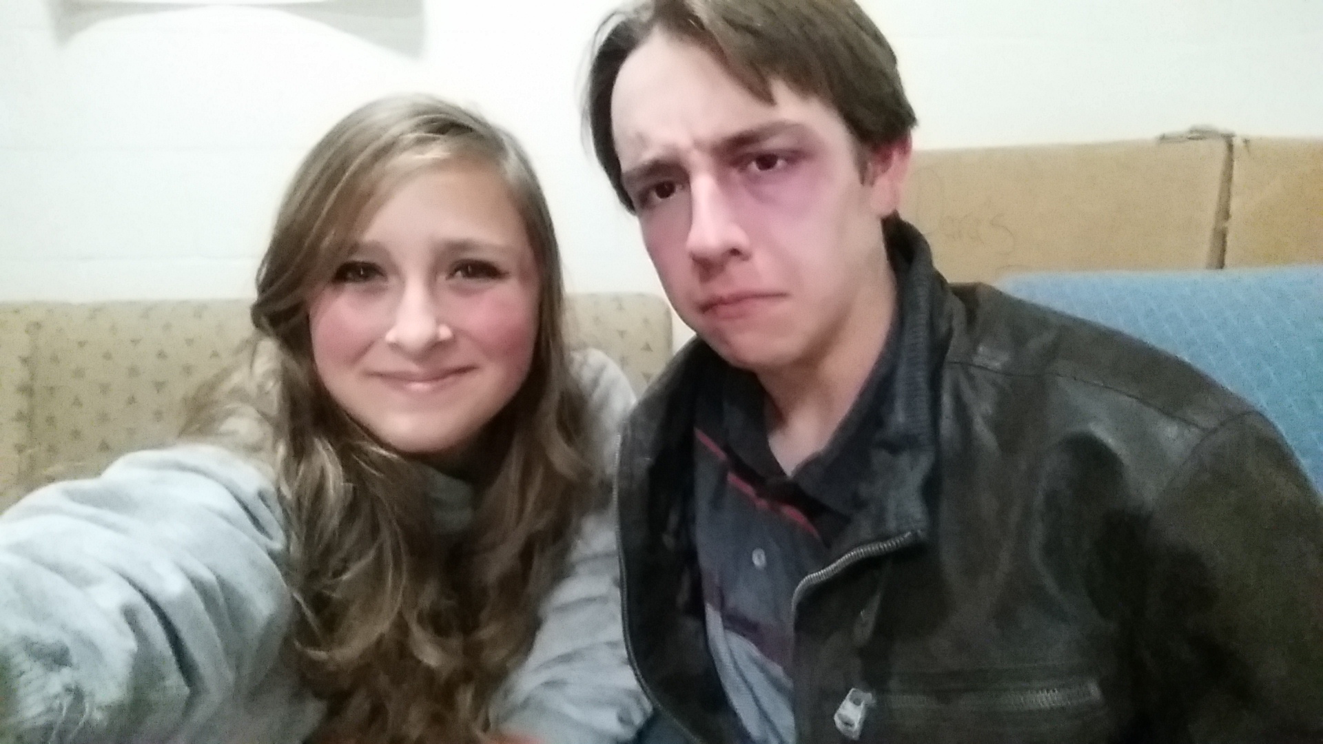 Then we met up on Sunday for an hour in my common room in Howard to make sure the other person had their lines memorized. We both did pretty good! I also practiced giving Simon a black eye for the scene. I really wanted him to look a little beat up but I wasn't sure how we were going to do it because I don't have a lot of makeup. I ended up using lipstick and it looks pretty good! I also made the bandage for my arm and the fake blood came out fine with a little lipstick and some red sharpie. =P Here's a picture of the makeup on Simon: