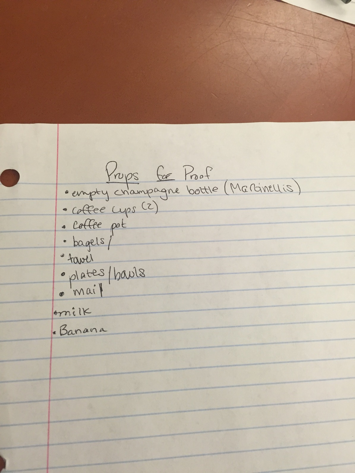 Since Friday Emma and I rehearsed twice, Sunday and Tuesday, for an hour each time. Our primary focus was blocking and getting offbook. We ran through the scene several times and tried out different blocking in order to find the most natural blocking. We talked about props and costumes as well, deciding on a props list which we have attached below. I was also able to acquire a Martinelli's bottle, and I scratched off the label so it could pass as a champagne bottle. We are well on our way to having all of our props. Our rehearsals went well, we found good blocking and moments that we hadn't seen before. I think that the scene has become a lot more natural as we continued to run it together. Getting offbook on such short notice was hard, but it helped heighten the stakes within the scene because we didn't have long to make the scene work. In future rehearsals we want to work on fluidity in the scene and more specific movement as well as highlighting important power shift moments.